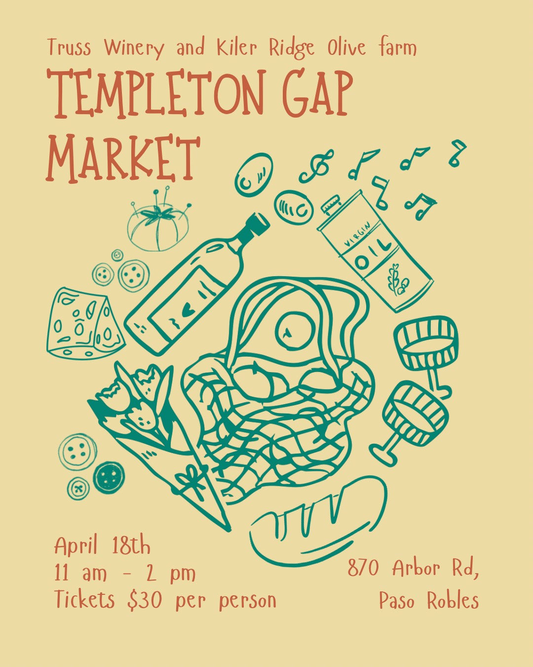 Discover local flavors and craftsmanship at Templeton Gap Market at Truss Winery, a co-hosted event by Kiler Ridge Olive Farm and Truss Winery, featuring local vendors, live music, and a pondside picnic. Your ticket includes a glass of Truss wine, Kiler Ridge Olive Oil tasting, a tote bag, and flower bouquet activity.